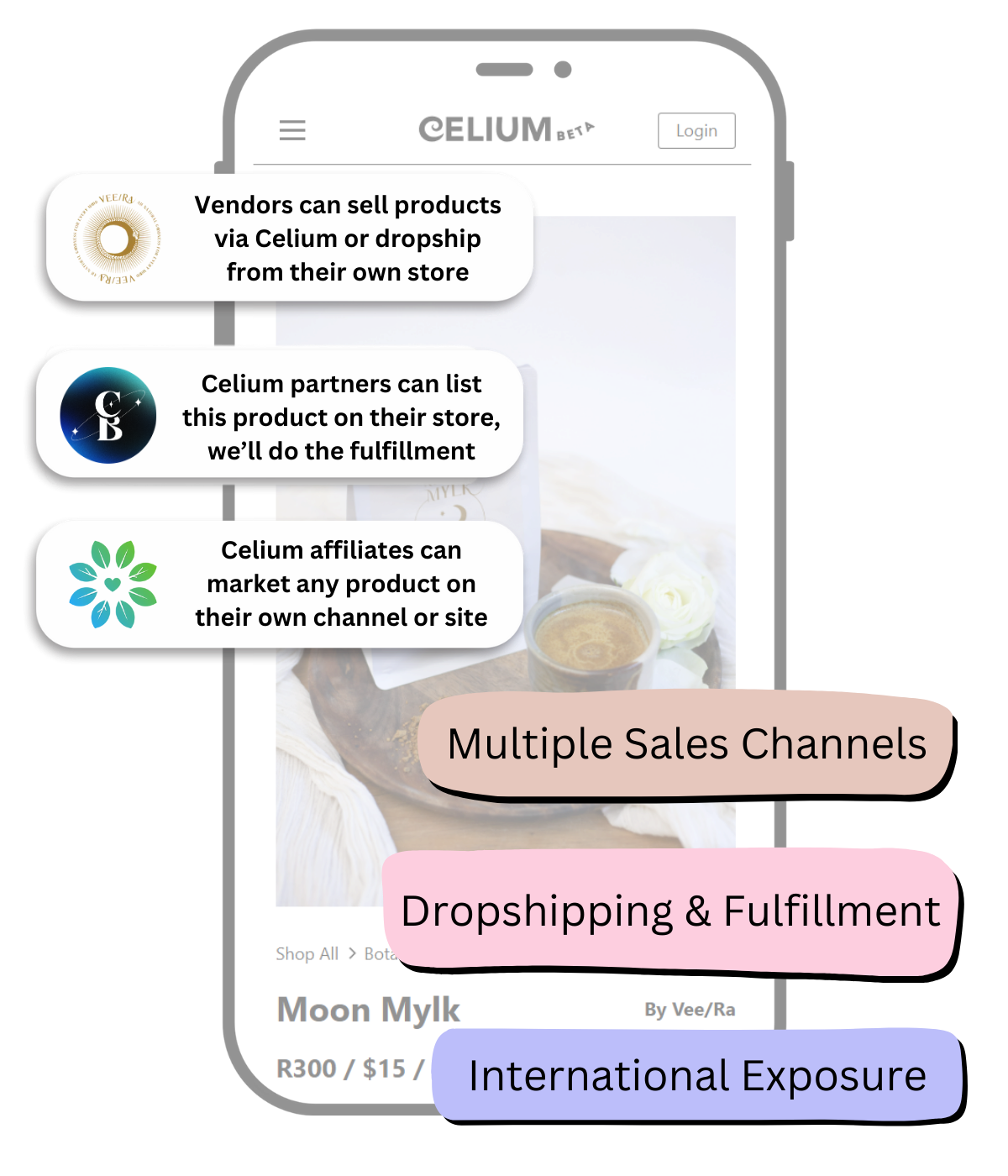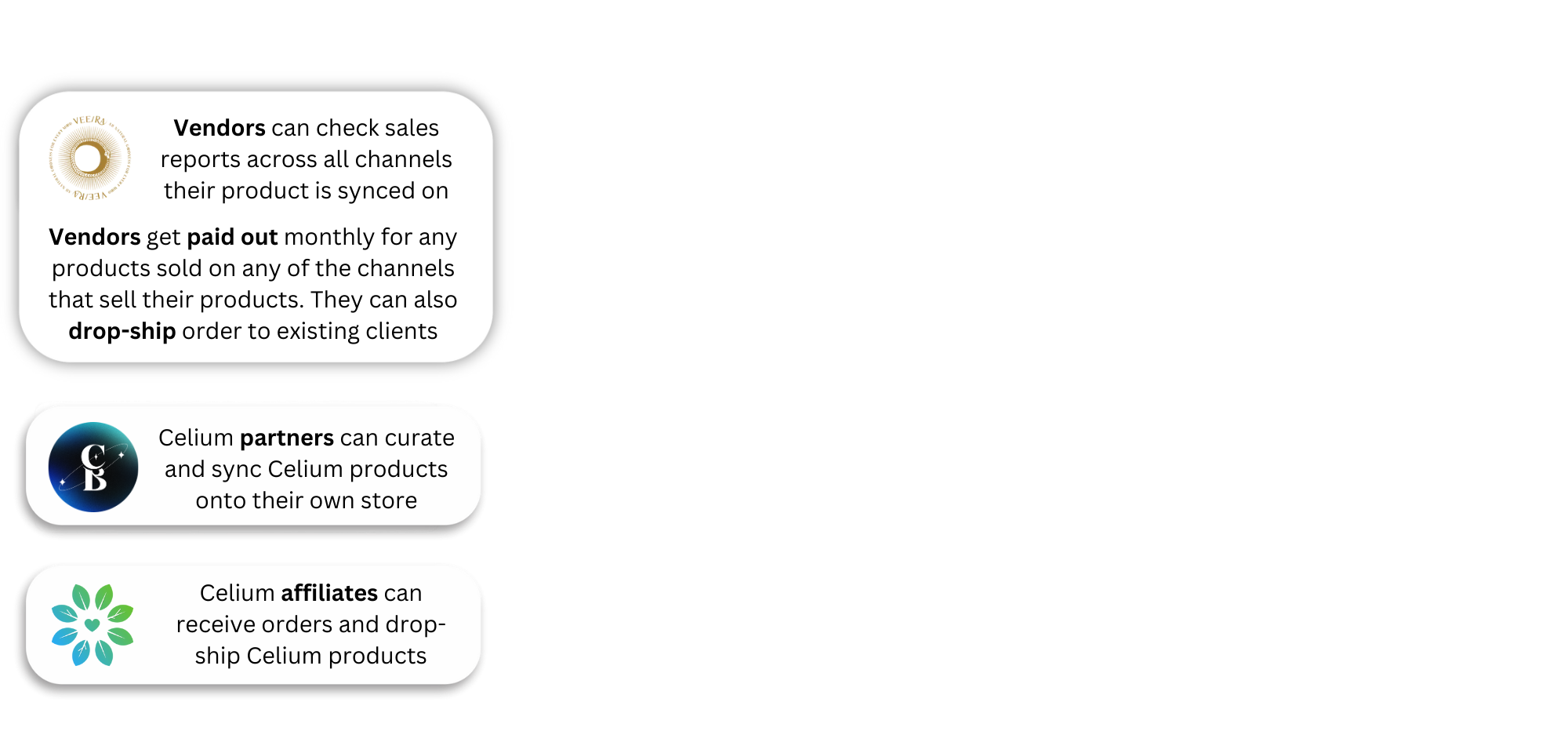 Connect your store and products (services coming soon) to others that are using Celium, sharing your products onto other platforms, or listing other vendors products. Let's create abundance by venturing into new territory (together) with B2B, distribution, wholesale and collaboration opportunities.